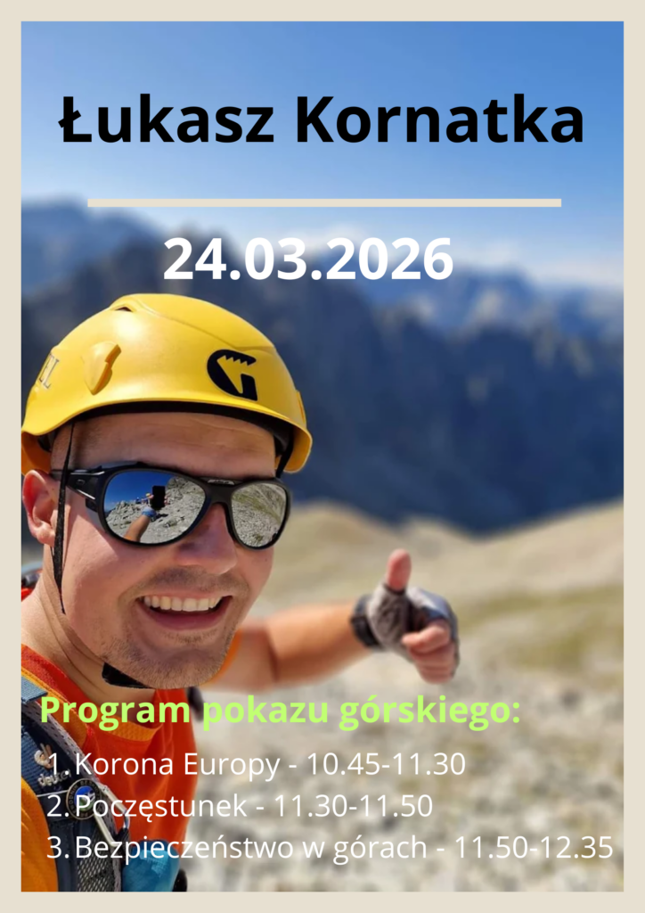 Dnia 24 marca 2026 roku na terenie naszej szkoły została zorganizowana prelekcja górska, którą przeprowadził Pan Łukasz Kornatka. Pan Łukasz jest znanym Taternikiem i Alpinistą. Dodatkowo jest przewodnikiem górskim oraz pilotem wycieczek. W czasie spotkania można było posłuchać ciekawych opowieści z wypraw oraz zobaczyć nieznane oblicza gór.